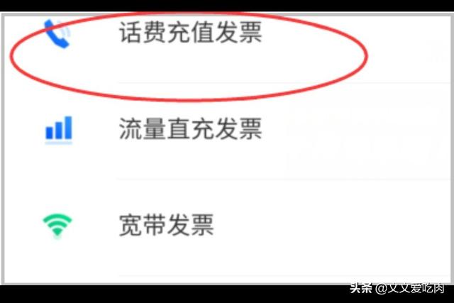 4、然后选择需要开具的发票类型,下图中选择“话费充值发票”。