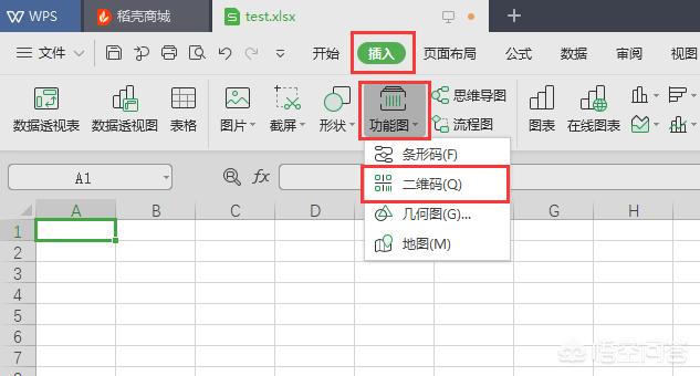 1.新建一个excel文件并打开,依次点击菜单栏的“插入”->“功能图”->“二维码”,如下:
