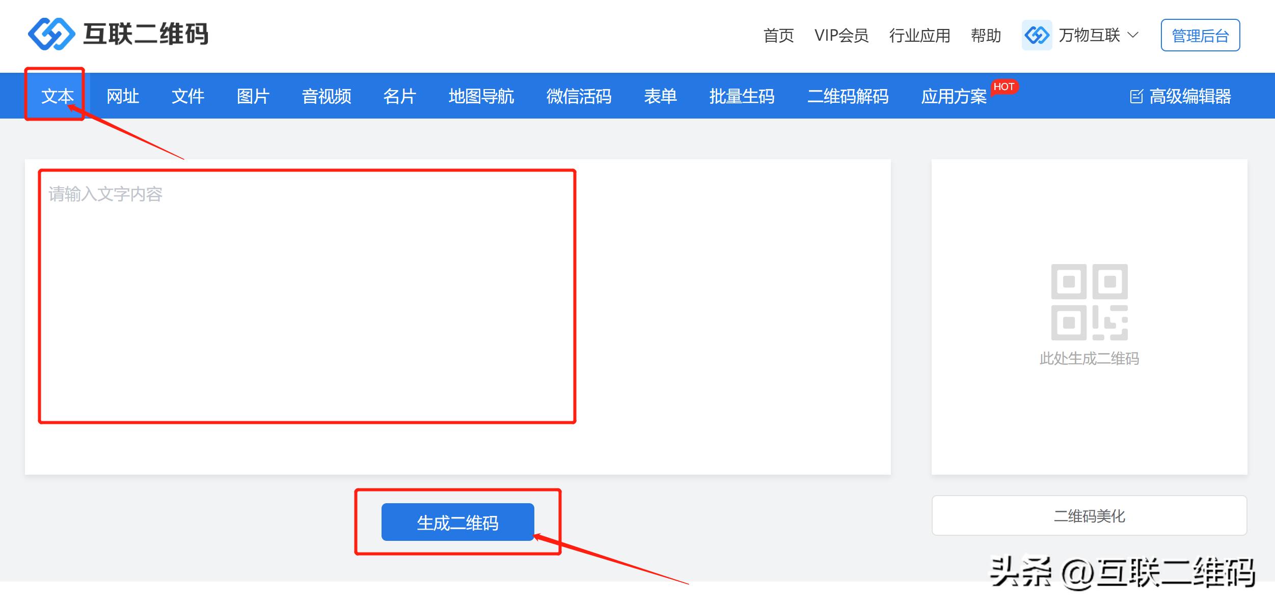 打开互联二维码生成器官网,导航栏选择【文本】,编辑需要生成二维码的文字,编辑完成直接点击【生成二维码】即可。