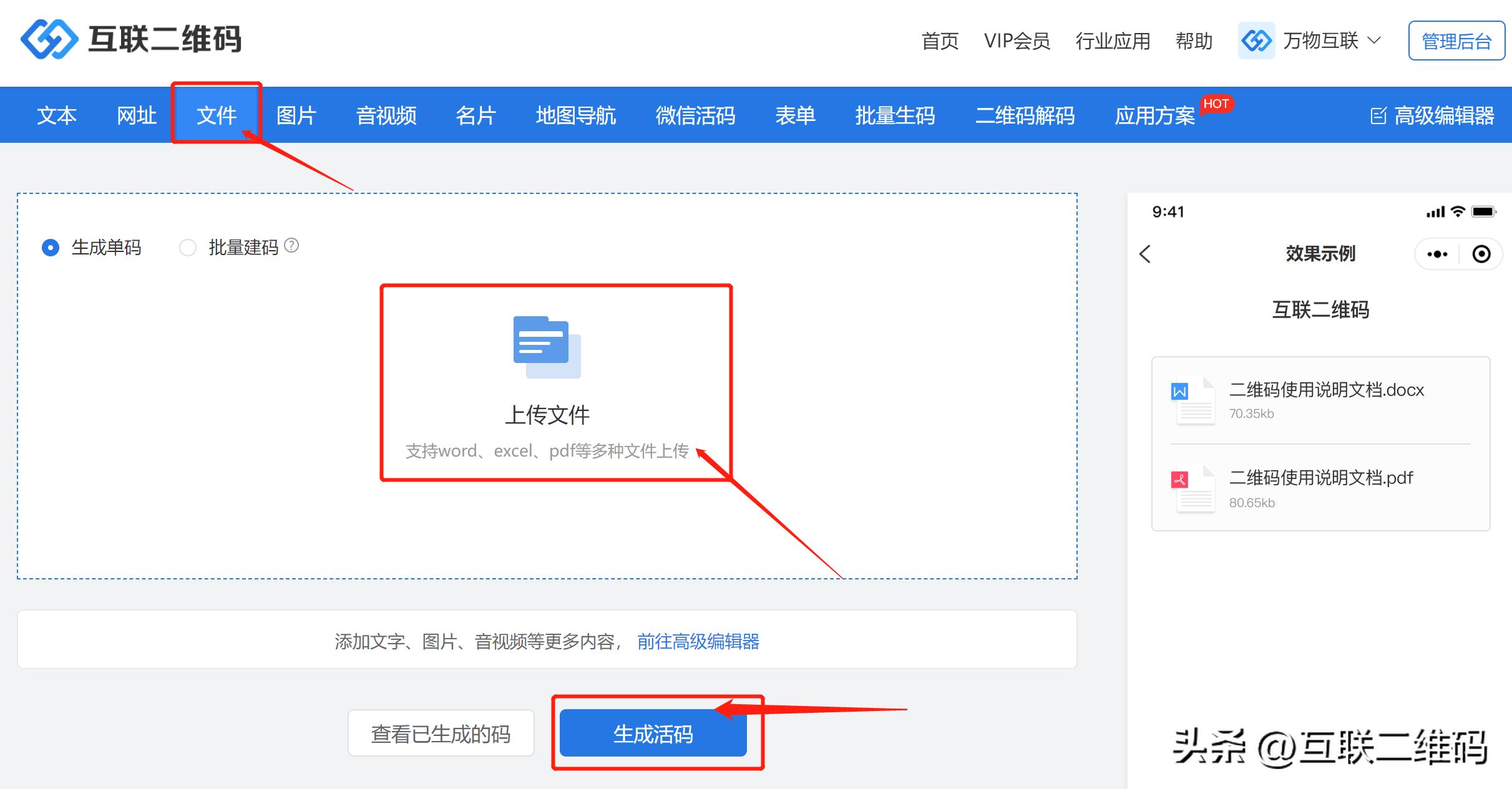 导航栏选择【文件】,接着将本地文件上传至后台,上传完成后点击【生成活码】。