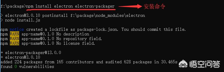 2.安装完成后,需要安装一下electron和electron-packager这2个打包工具,这个直接在cmd窗口输入安装命令“npm install electron electron-packager”即可,如下: