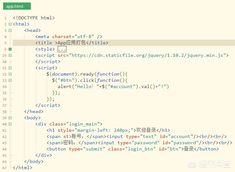为了方便演示,这里我新建了一个app.html文件,测试代码如下,非常简单,就是一个登陆页面,输入用户名和密码,提交后打印出欢迎对话框: