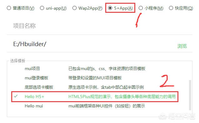 3.接着,我们打开这个软件,依次点击菜单栏的“文件”->“新建”->“项目”,项目类型选择“5+APP(A)”,模板选择“Hello H5+”,如下: