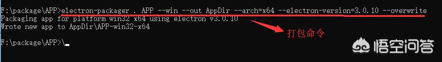 最后就是在cmd中打包了,先切换到这个文件夹,然后输入打包命令“electron-packager . APP --win --out AppDir --arch=x64 --electron-version=3.0.10 --overwrite”就行,如下,就会自动开始打包过程,非常快,这里的打包参数主要是指明打包后的应用名称、位数、版本号等: