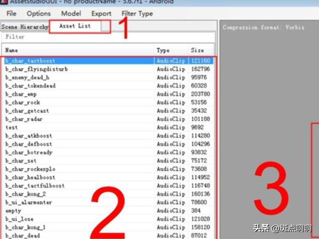 5、点击1处左上角的 Asset List展开列表框2处 全部都是声源文件列表框3处 可以试听文件是否需要文件