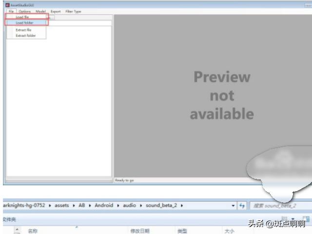 4、第一项load file 是导入单个文件第二项load folder是导入整个文件夹文件路径一般在 解压路径\游戏包名称\assets\AB\Android\audio 里面随便打开一个后缀带.ad的文件